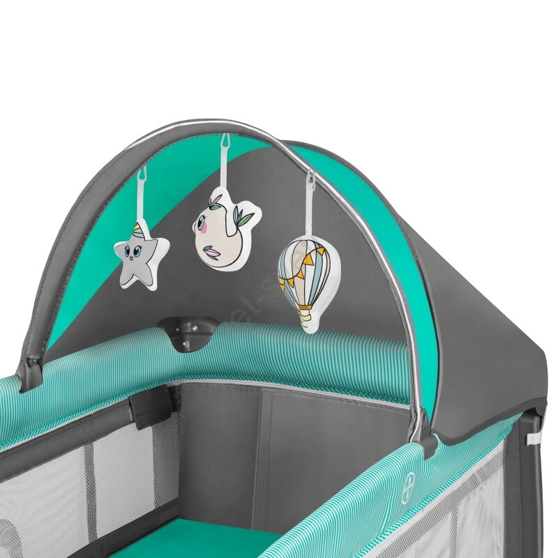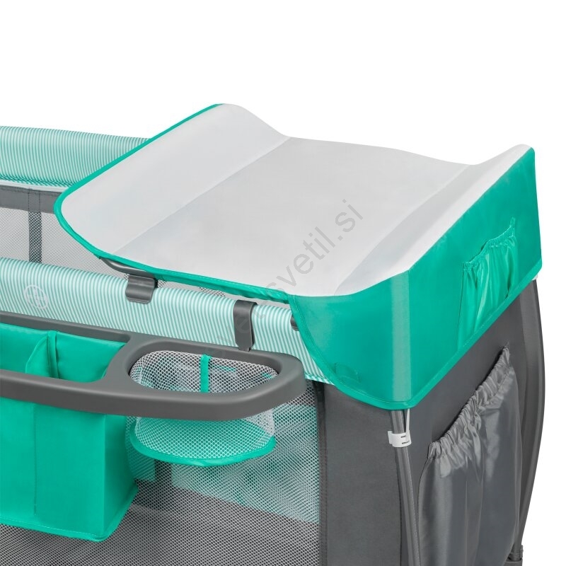 • V paketu je: previjalna miza s stranskimi žepi (za plenice, puder ipd.), koš za dodatke z dvema predalčkoma, velika mreža proti komarjem, strešica in igralna prečka s plišastimi igračami.