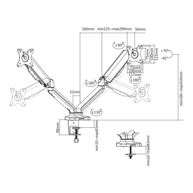 • Po pritrdítvi nosilca na mizo so možni stranski premiki, horizontalno in vertikalno obračanje zaslona, nagib v različnih kotih in nastavljanje višine.
