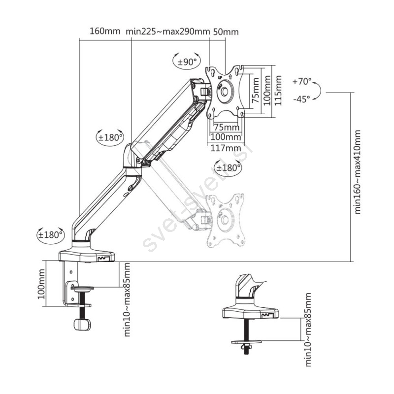 • Po pritrdilu nosilca na mizo so možni zasuk v levo in desno, horizontalno in vertikalno obračanje zaslona, nagib pod različnimi koti ter nastavljanje višine.