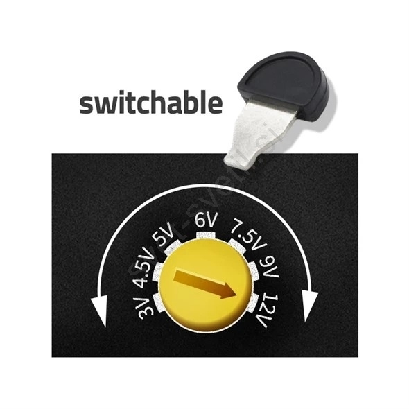 • S priročnim vrtljivim preklopnikom izhodne napetosti omogoča enostavno nastavitev želenega napetostnega nivoja v razponu 3–12 V DC, kar zagotavlja združljivost z različnimi napravami.