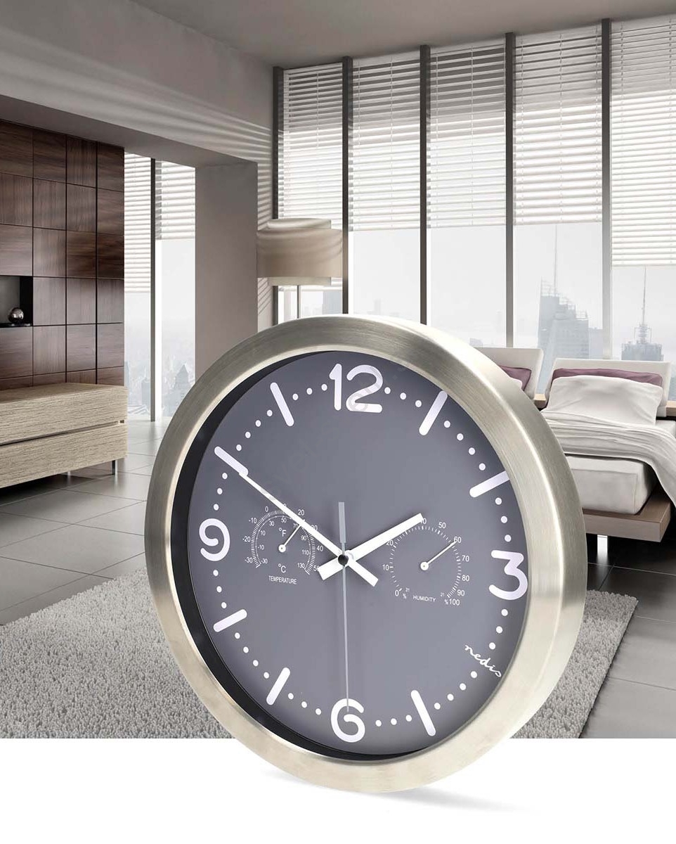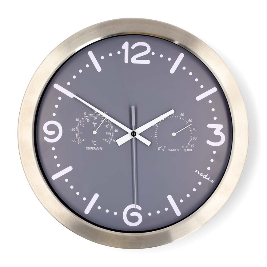Stenska ura s termometrom in merilnikom vlažnosti, premer 30,5 cm, 1xAA, nerjaveče jeklo/siva