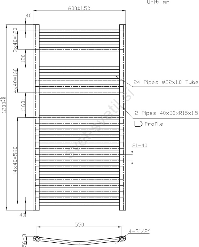 Novaservis - kopalniški rebrasti radiator za brisače 644 W/230 V 120 x 60 cm, bel, zaobljen