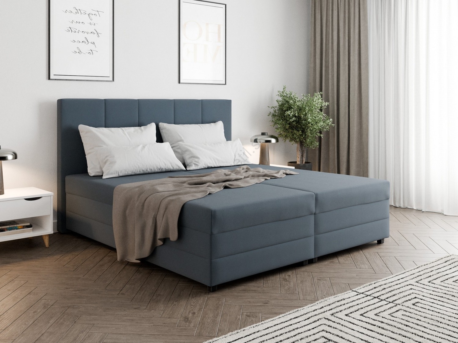 • Tapecirana zakonska postelja z vzmetnicami in visokim, ravnim ter elegantnim vzglavjem.