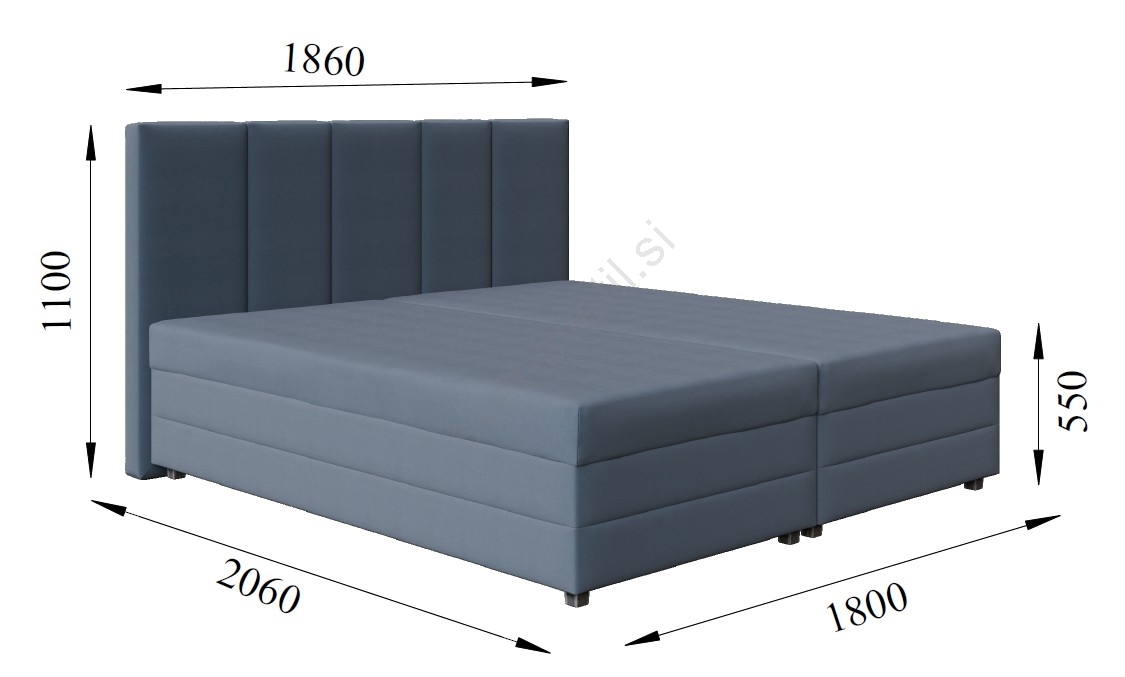 • Tapecirana zakonska postelja z vzmetnicami in visokim ravnim elegantnim vzglavjem.