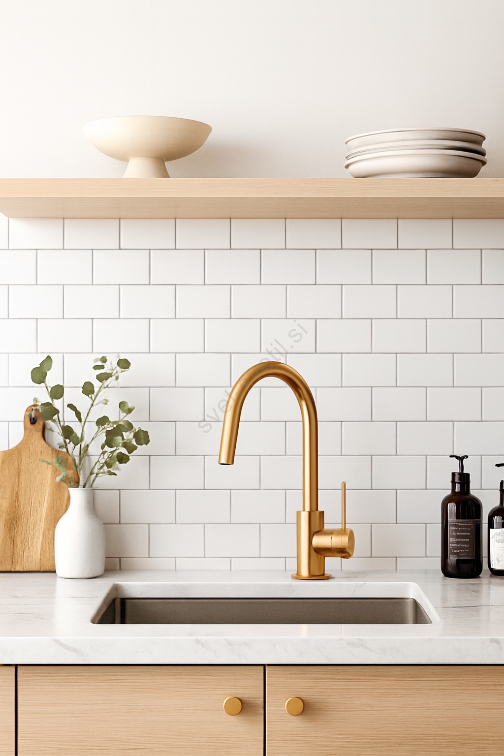 • Elegantna pipa za umivalnik v toplih zlatih tonih.