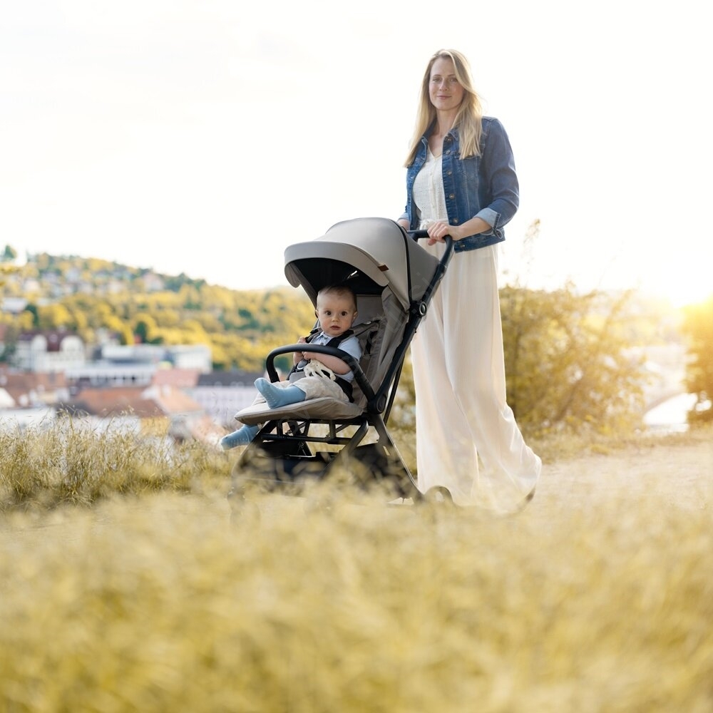 • Sodoben otroški voziček, ki združuje kompaktne mere, nizko težo in praktične funkcije.