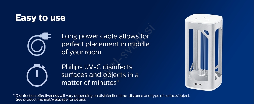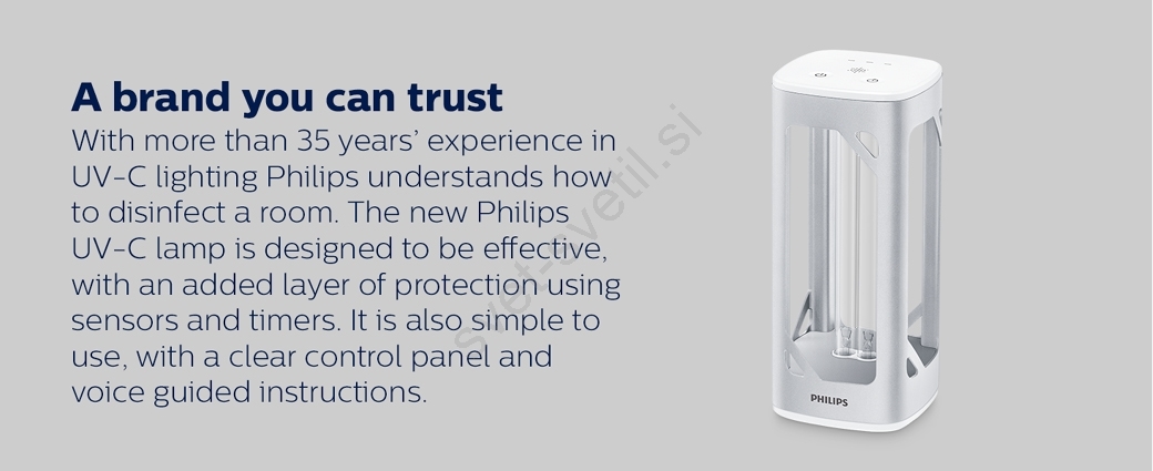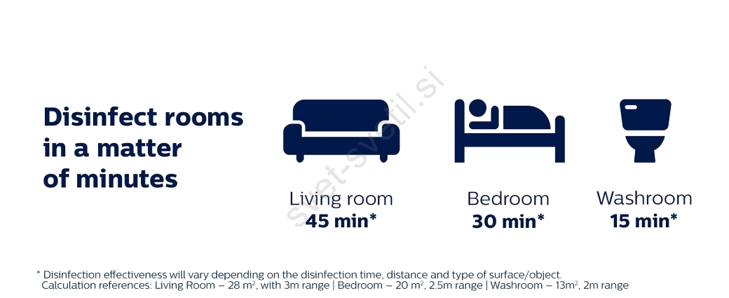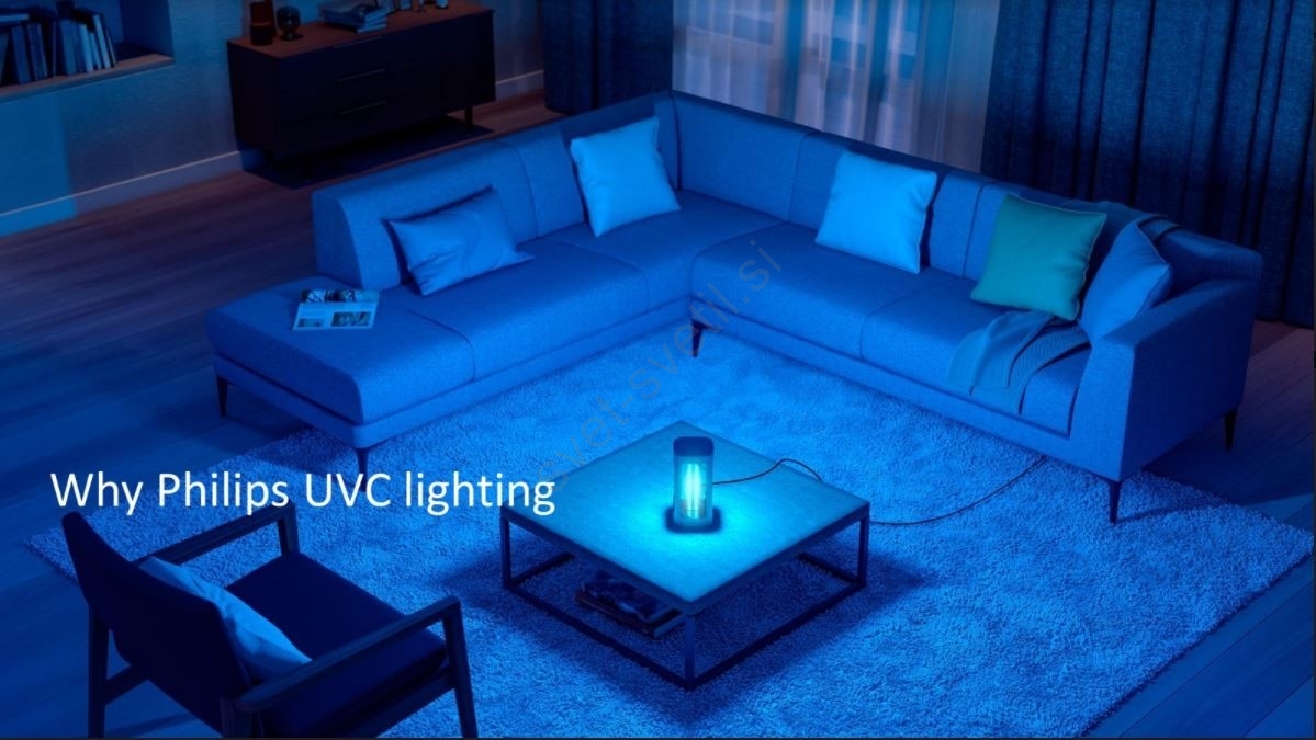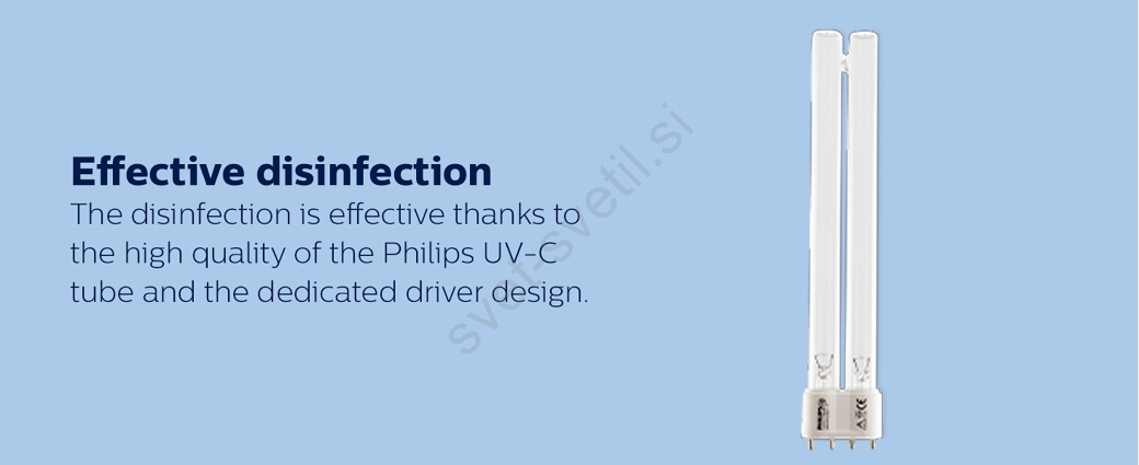 Ta izdelek vsebuje živo srebro. Izdelek oddaja ultravijolično sevanje, ki je nevarno. Ni namenjeno za uporabo v splošni osvetlitvi. Sevanje iz tega svetlobnega vira je nevarno in škodljivo za kožo, sluznice in vid. Da bi se izognili poškodbam zdravja (poškodbe, opekline, bolezni), se je treba izogibati neposredni in posredni izpostavljenosti svetlobi. Germicidne svetilke ne bi smele neposredno obsevati prostorov, kjer se nahajajo ljudje, živali in rastline. Po sterilizaciji je priporočljivo prezračevanje 20-30 minut.