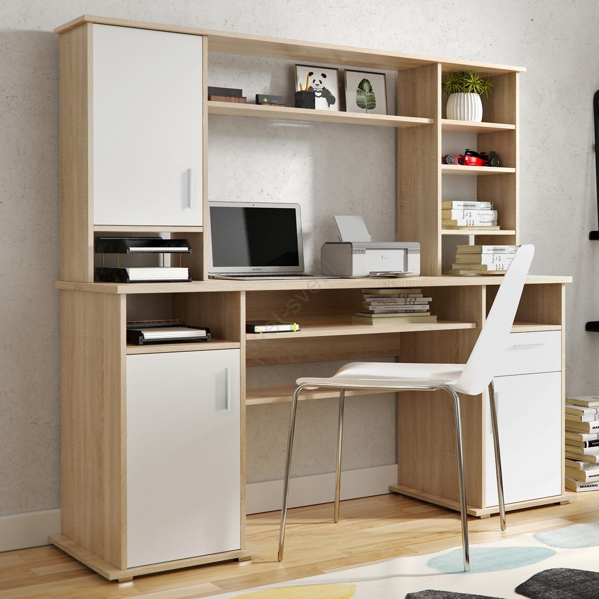 • Zgornji del ponuja dodatne police za knjige, dekoracije ali pisarniške potrebščine, zato je idealen za delovne prostore, ki zahtevajo funkcionalnost in urejenost.