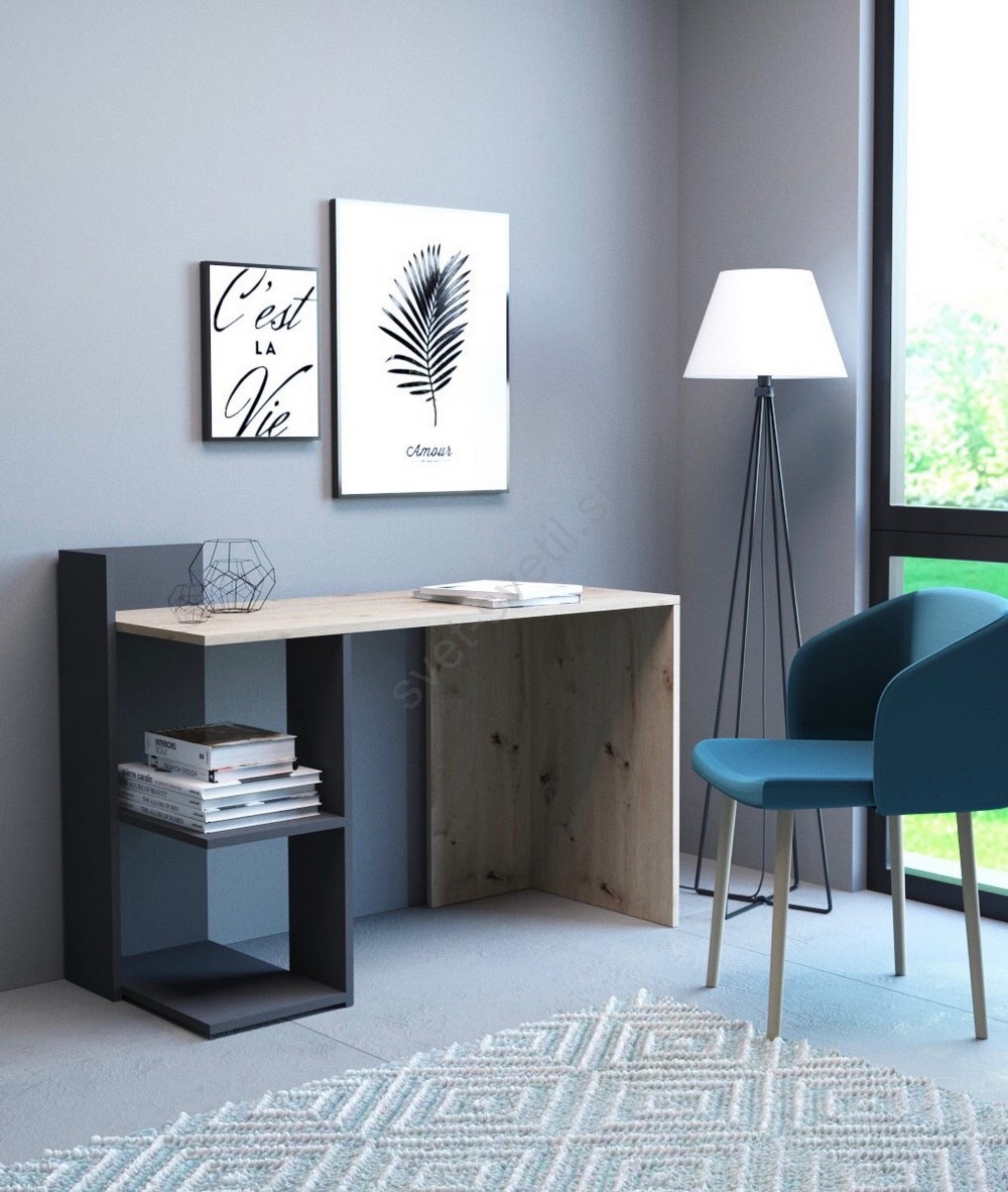 • Pravokotna delovna površina je podprta s bočno polico z dvema odprtima policama, idealnima za shranjevanje knjig, pisarniških pripomočkov ali dekoracij.