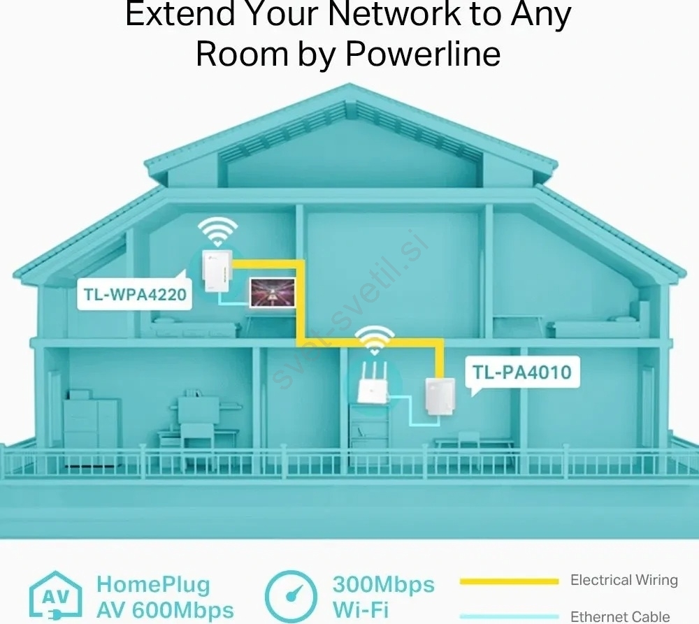• Prenosna hitrost do ~600 Mb/s po električnem omrežju in do ~300 Mb/s prek Wi-Fi.