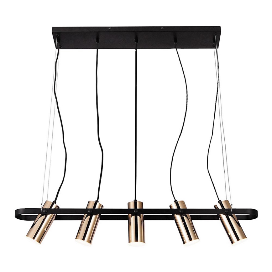 Viseča svetilka Raven s petimi svetili priporočamo tistim, ki jih pri opremljanju doma ne presenetijo izjemne in inovativne rešitve. Dizajn viseče svetilke Raven, izdelane v industrijskem slogu v mat črno-zlati barvni kombinaciji, ni nikakor običajen. Kovinsko ohišje svetilke, opremljeno z pravokotno, mat črno dekorativno podlago, dopolnjujejo podolgovata valjasta senčila, prav tako izdelana iz kovine. Pet zlatih glav svetilke je obdano s podolgovatim ovalnim elementom. Viseča svetilka, ki oddaja toplo belo svetlobo, bo stilski dodatek vašemu sodobnemu dnevnemu prostoru. Vgrajeni LED svetlobni viri svetilke Raven imajo skupno moč 25 W, svetilnost 2.000 lumnov in barvno temperaturo 3.000 K. Širina svetilke je 820 mm, razdalja od stropa pa 1.200 mm. Na visečo svetilko Raven velja 5-letna garancija.