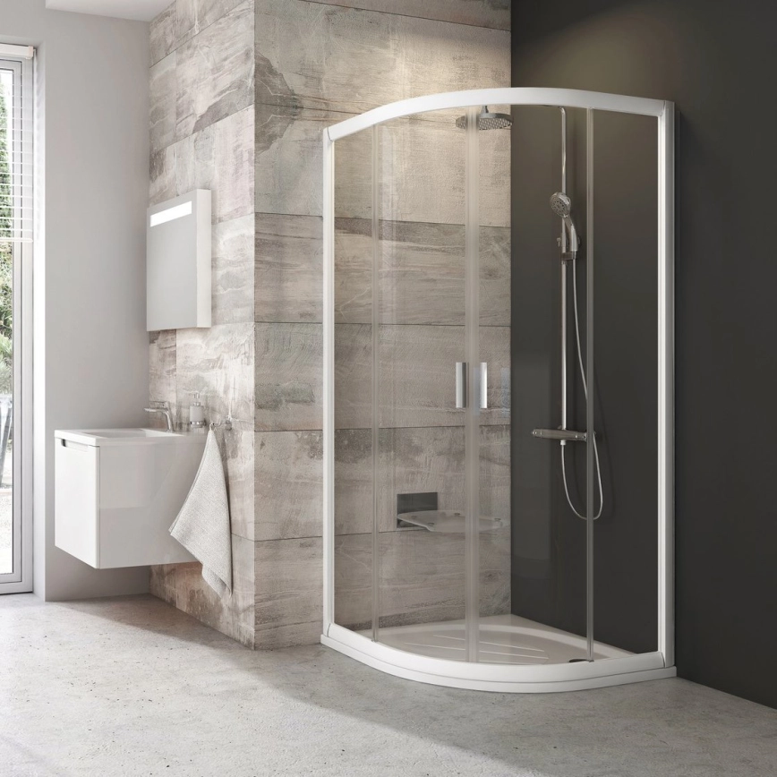 • Štiridelna četrtkrožna tuš kabina Blix v elegantni beli izvedbi s kromiranimi ročaji združuje brezčasen dizajn s praktičnimi funkcijami.