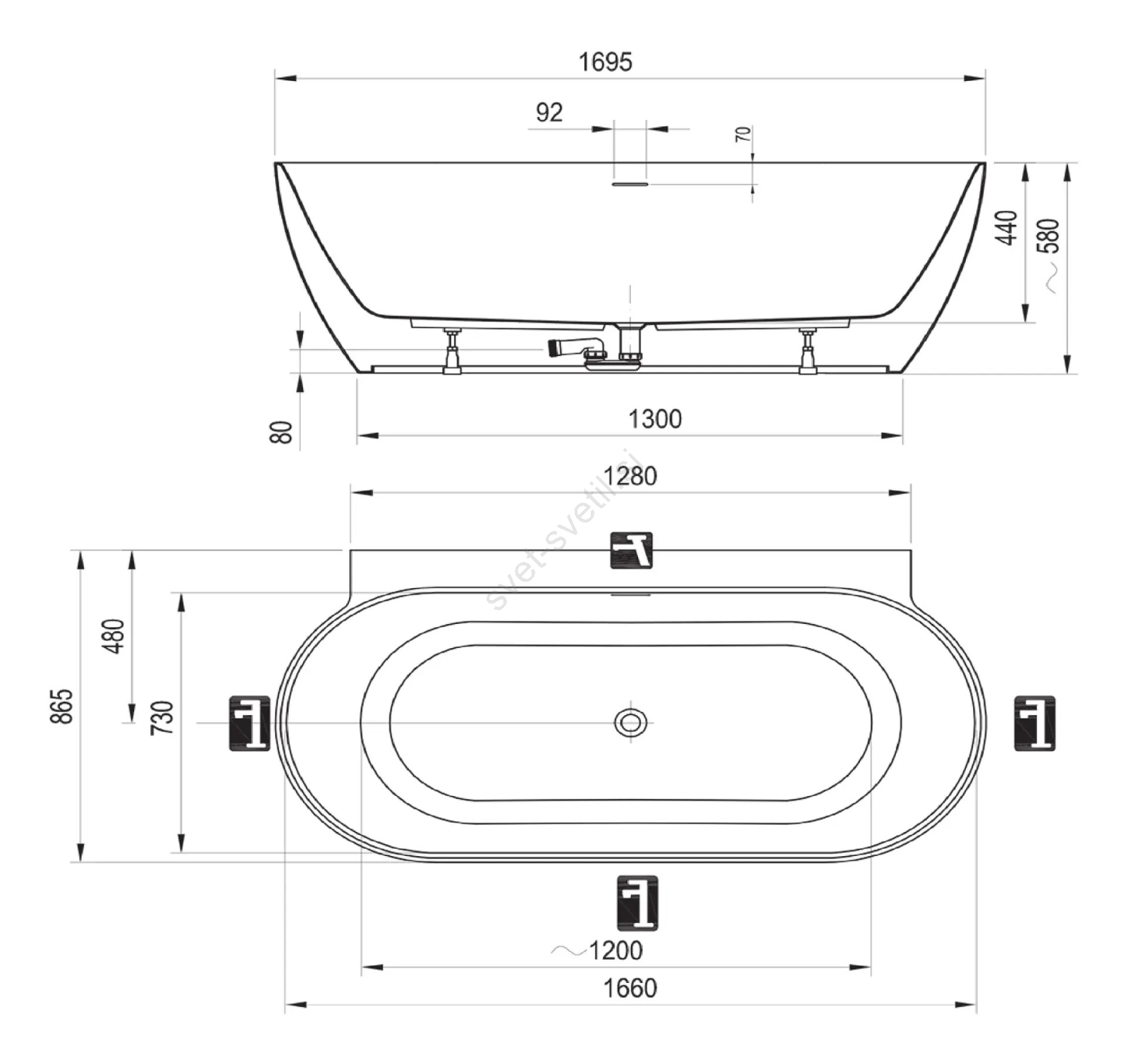 • Komplet kadnega odtoka (tj. preliv, odtočna rešetka, sifon, zapora proti vonju) in podpora (nogice) sta del paketa.