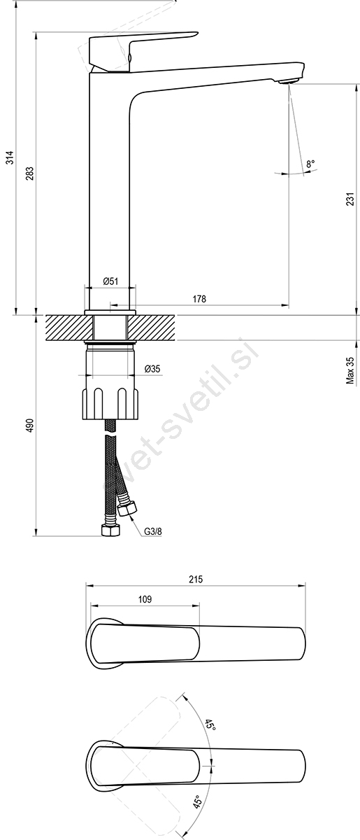 • Pipa je dobavljena brez odtočne garniture in vključuje fleksibilne priključne cevi dolžine 450 mm z navojem G3/8.