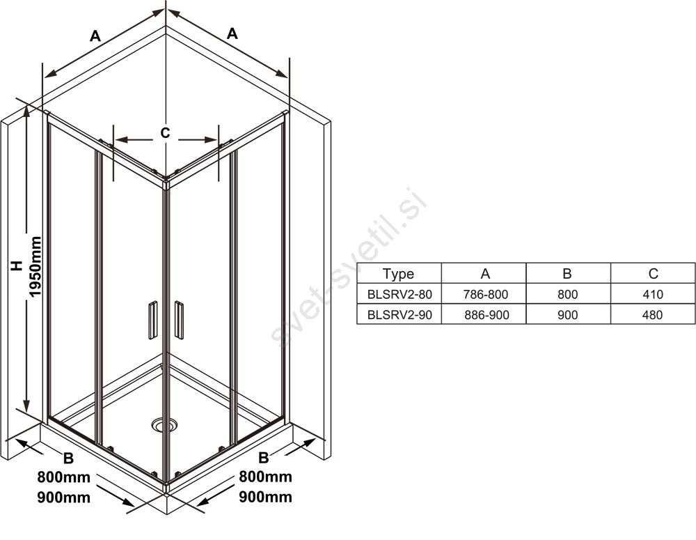 • Tuš kabina višine 195 cm je opremljena z drsnim odpiralnim sistemom, sestavljenim iz dveh fiksnih in dveh drsnih elementov.