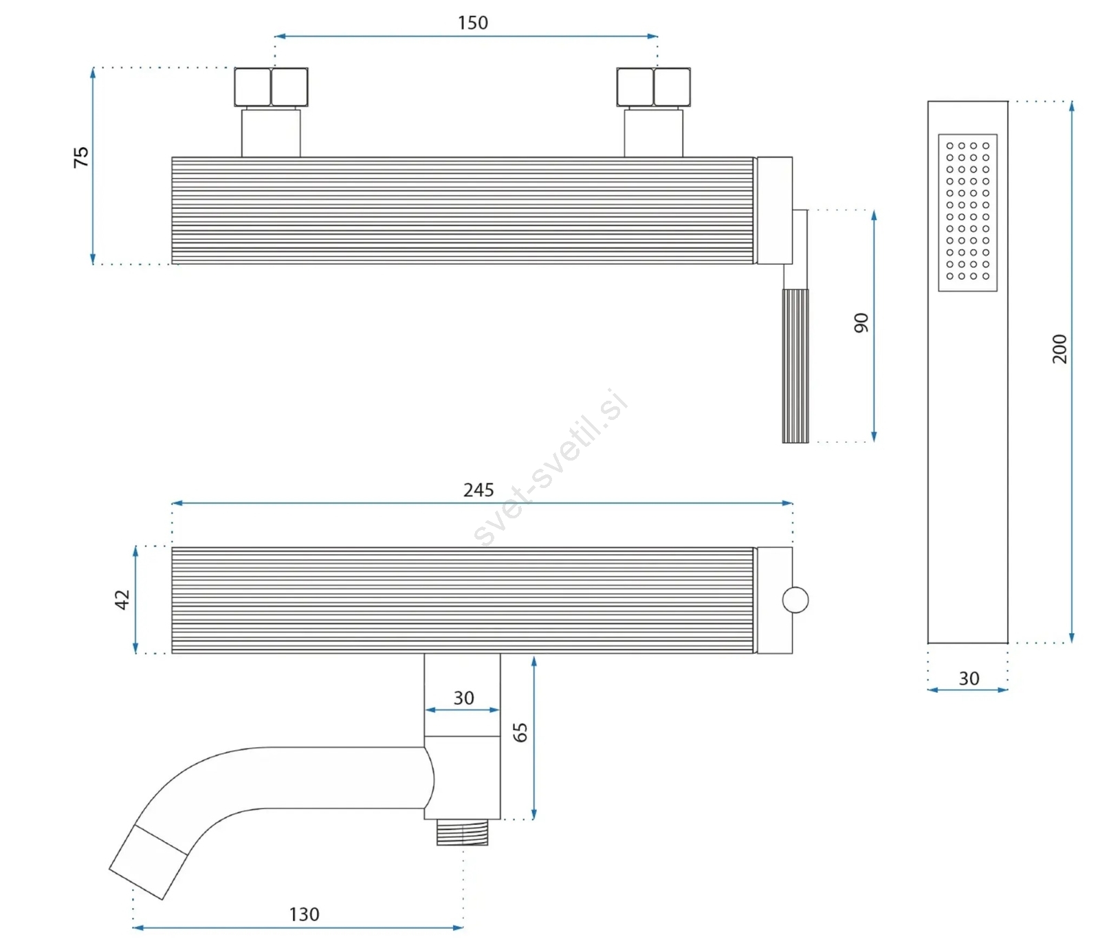 • Komplet vsebuje: kopalniško baterijo za kad, ročno prho, pršno cev, stenski nosilec za ročno prho.
