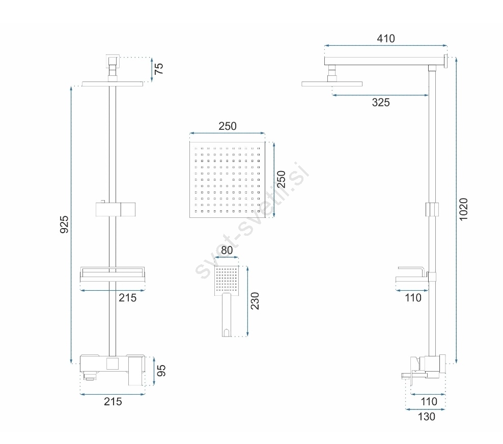 • V paketu: ročna in glavna prha, držalo za ročno prho, posodica za milo, mešalna armatura s kartušo in 150 cm cev.