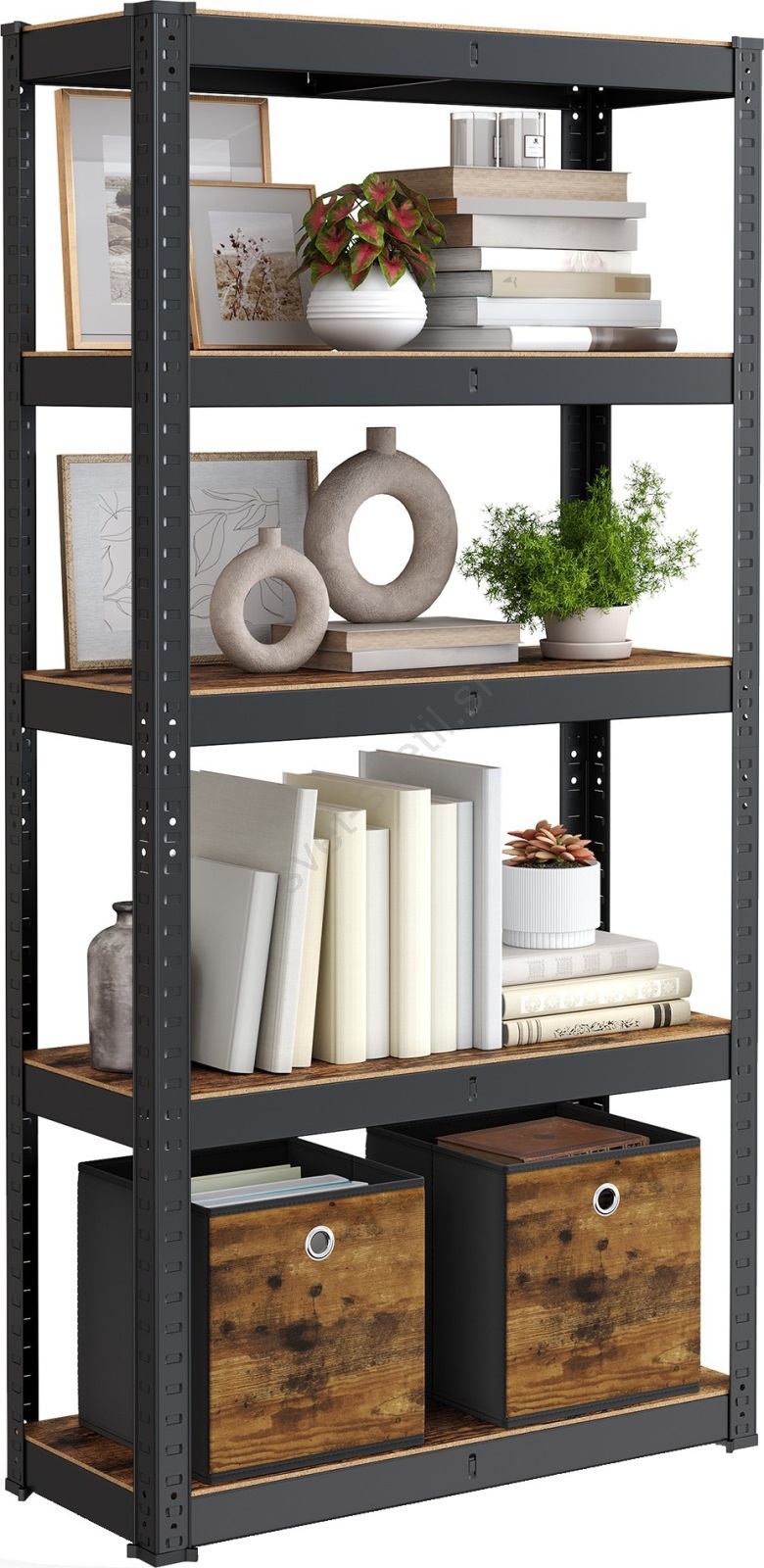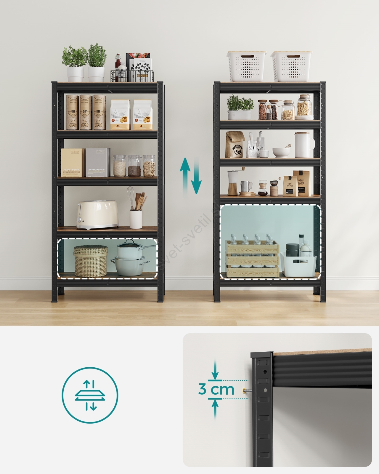 • Vsaka polica prenese do 130 kg in zanesljivo podpira barve, orodje ter fitnes opremo.
