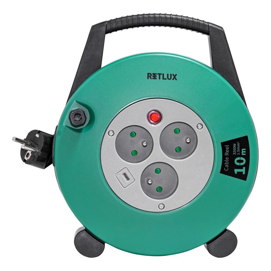 Retlux - Kolutni podaljšek z 3 vtičnicami, tip E, 10 m, zelena/črna