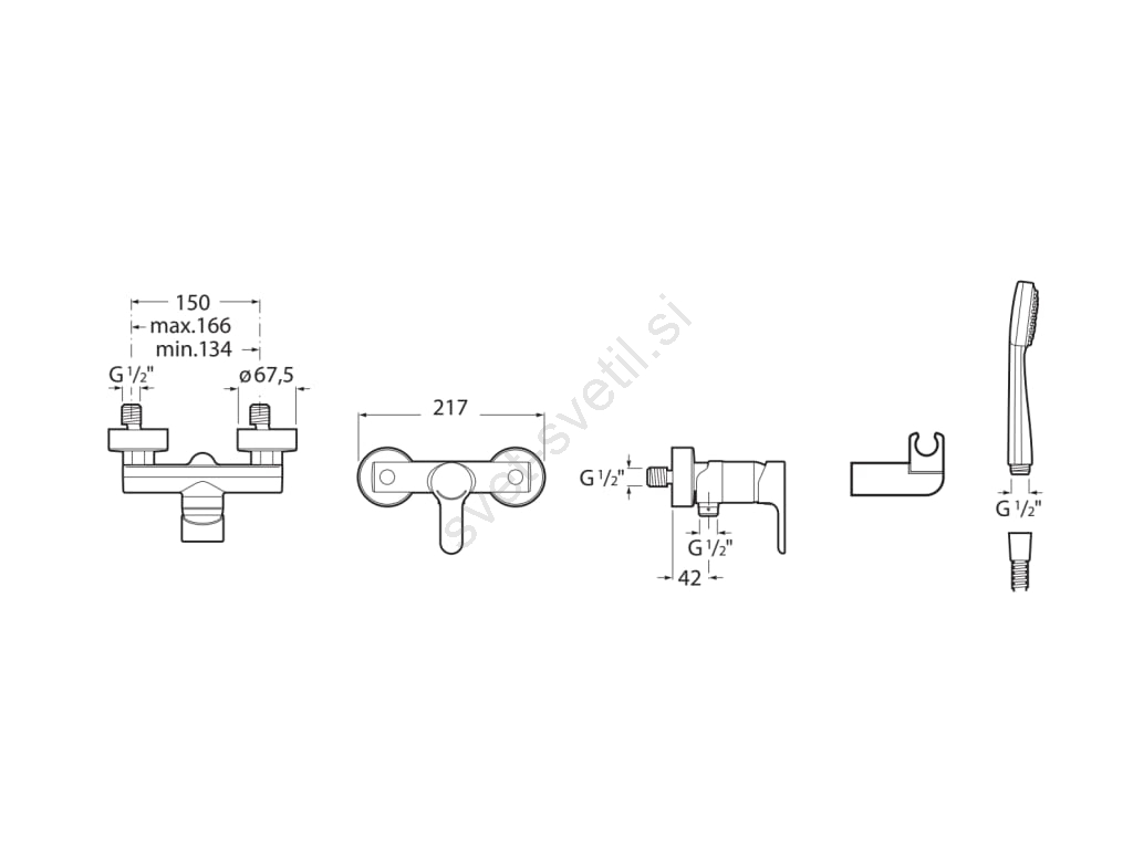 • Embalaža vsebuje: pršno armaturo, ročno prho, fleksibilno cev 1,5 m, vrtljiv stenski nosilec.