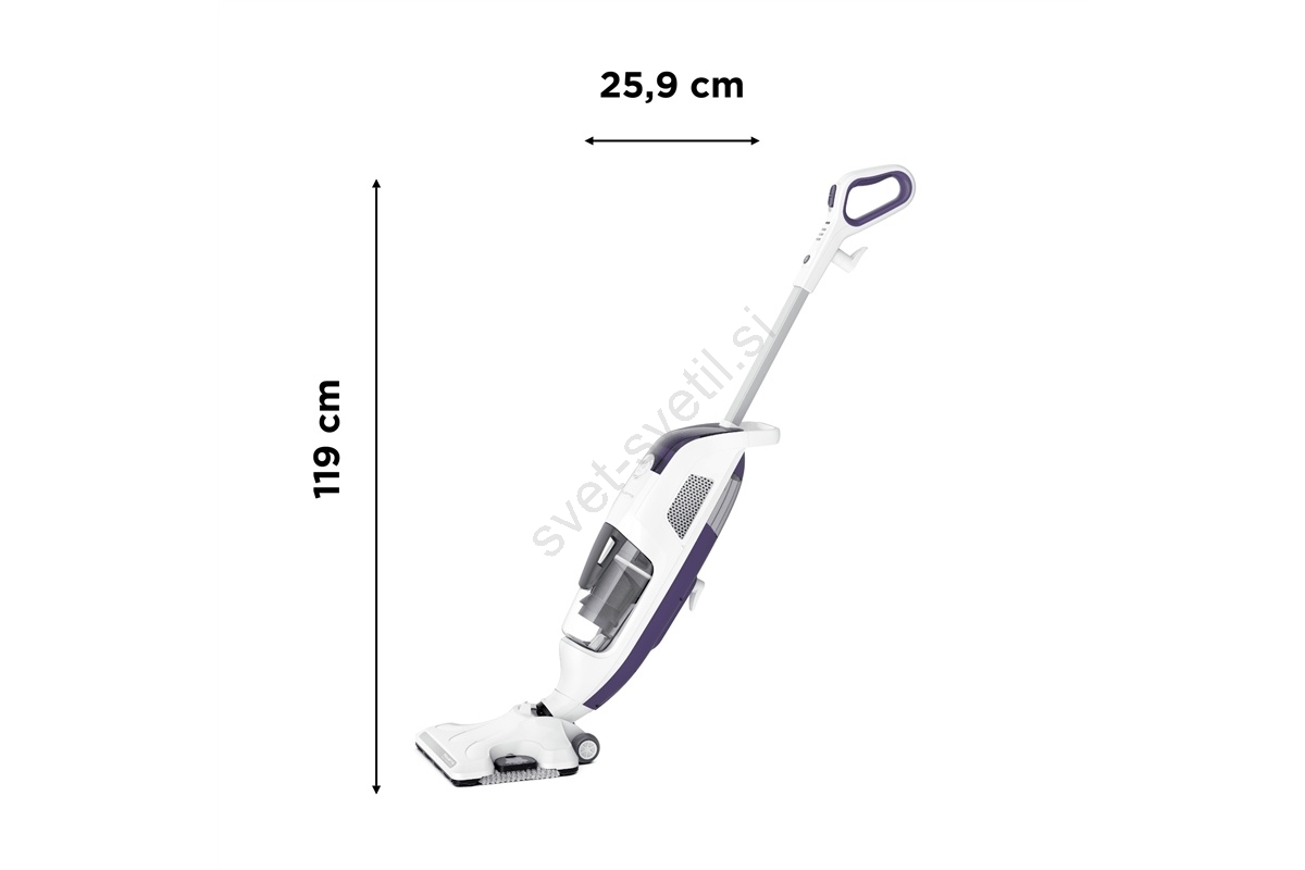 • Večfunkcijska naprava 2 v 1: pokončni sesalnik in hkrati parni mop — s tem v enem potegu posesate in obrišete tla.