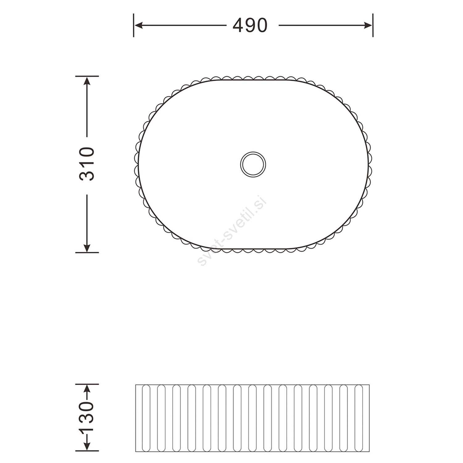 • Njegove dimenzije so 490x310 mm, višina pa znaša 130 mm.