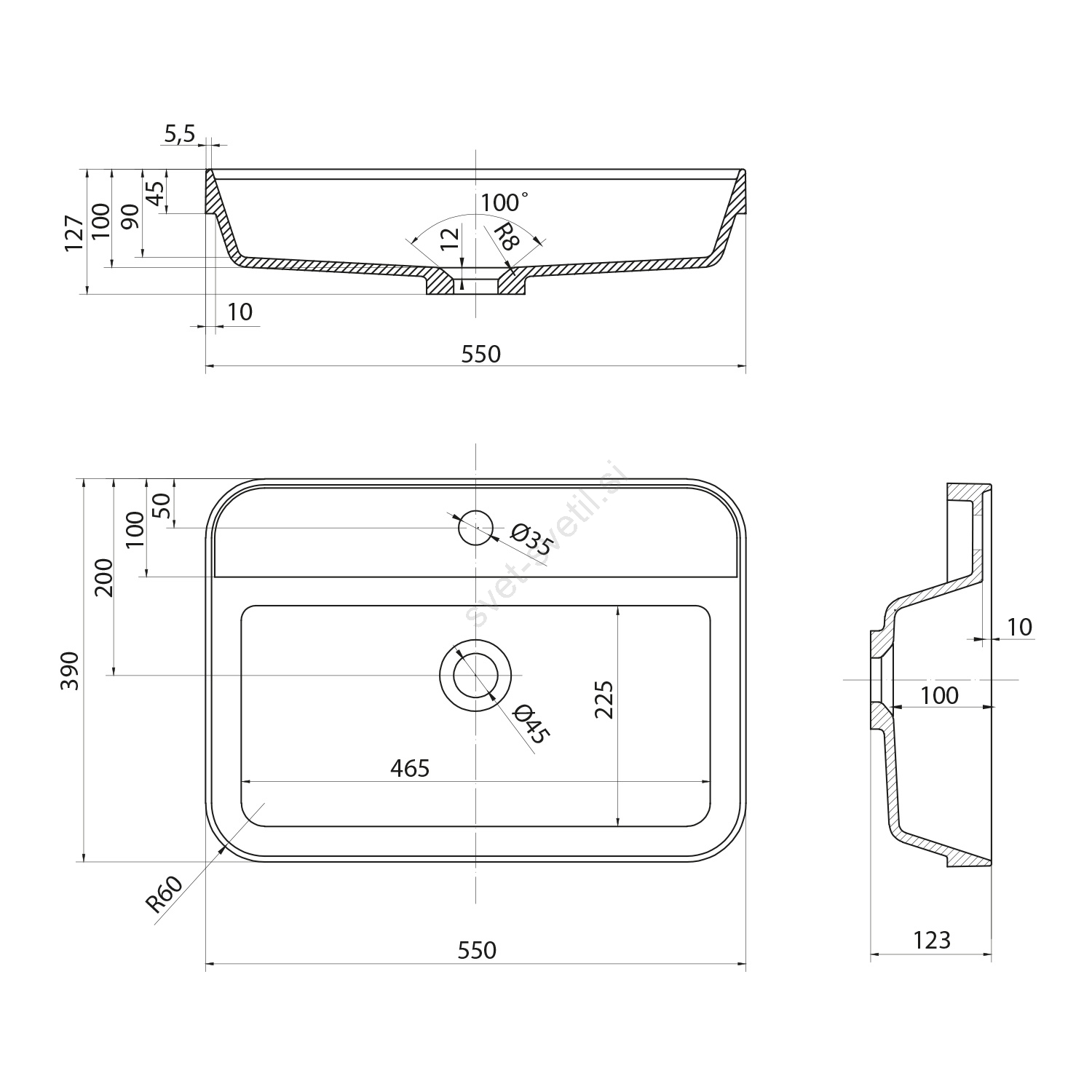 • Ima dimenzije 550x390 mm in višino 123 mm.