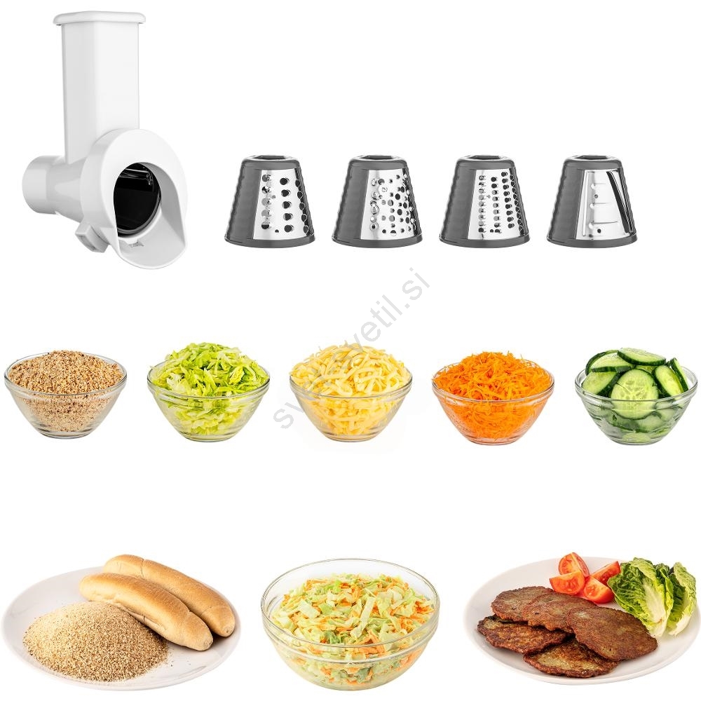 • V kompletu so 3 nastavki (gnetilni kavelj, mešalna metlica v obliki črke A, stepalna metlica v obliki balona), rezalnik za tanke rezine, ribalnik za valovite rezine, grobi ribalnik, fini ribalnik, zelo fini ribalnik.