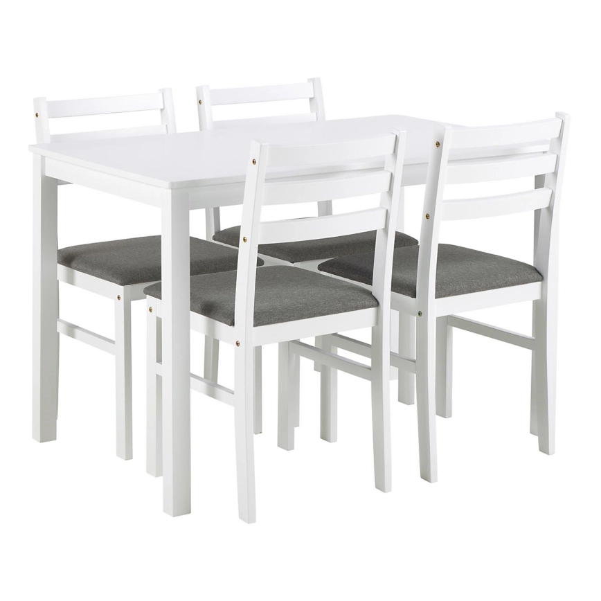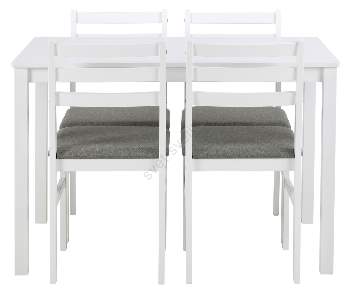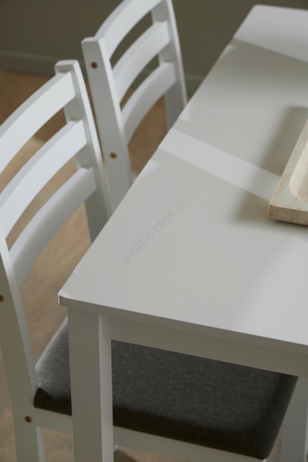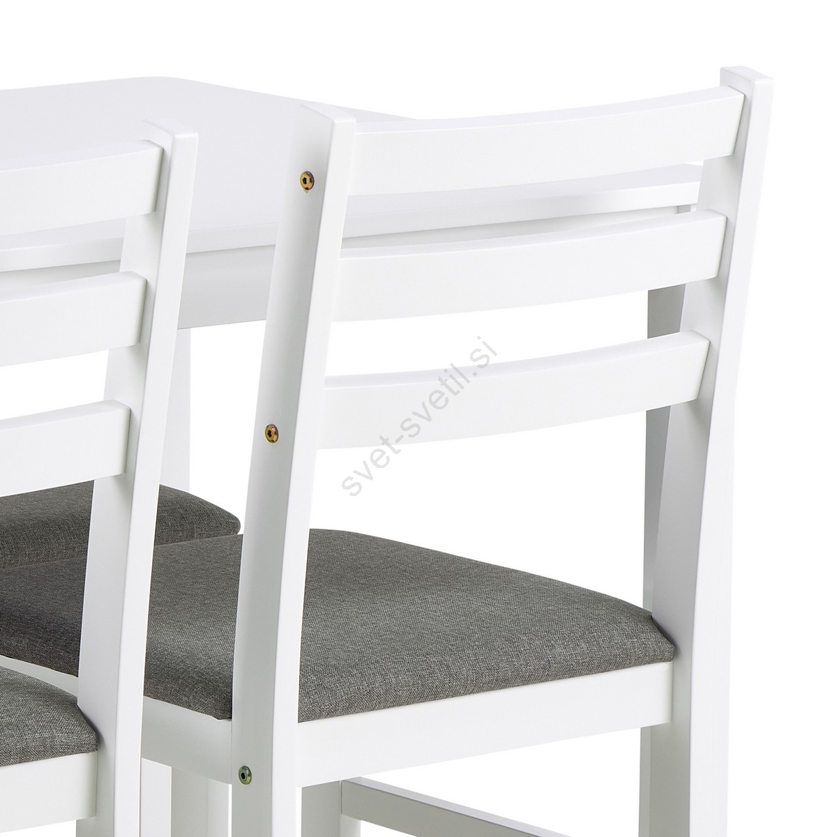 • Sestavljen je iz pravokotne jedilne mize in 4 ujemajočih se stolov z oblazinjenimi svetlo sivimi sedeži, vse izdelano iz masivnega lesa v beli izvedbi.