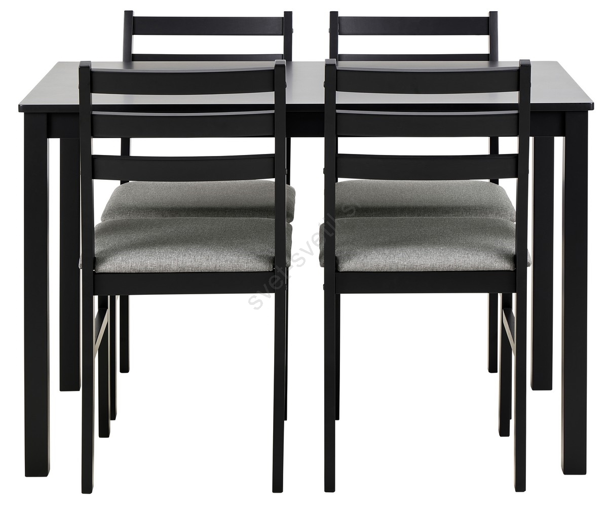 • Sestavljen je iz pravokotne jedilne mize in 4 ujemajočih se stolov z oblazinjenimi svetlo sivimi sedeži, vse izdelano iz masivnega lesa v mat črni izvedbi.