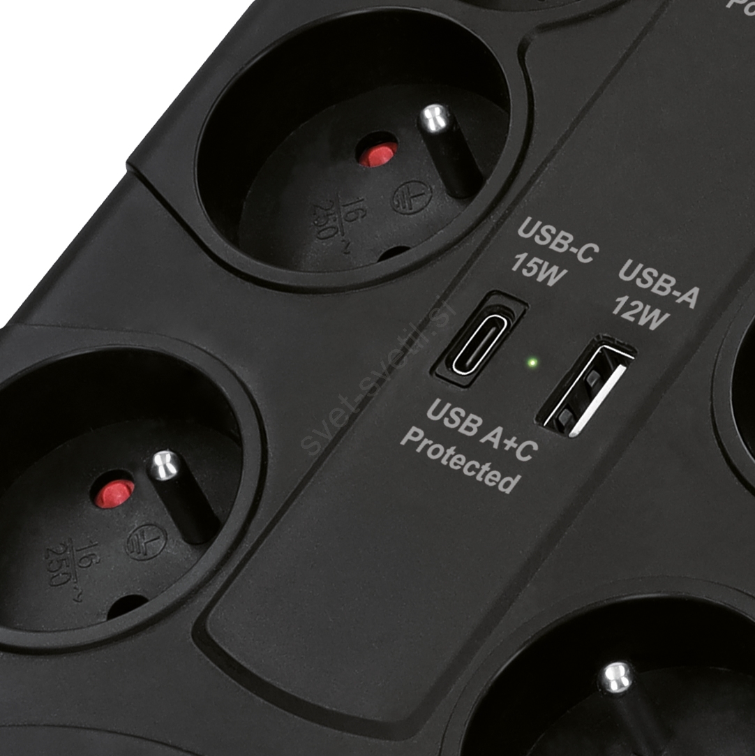 • LED indikacija Prenapetostna zaščita aktivní, Zásuvky 230V chráněny, USB A + C porty chráněny.