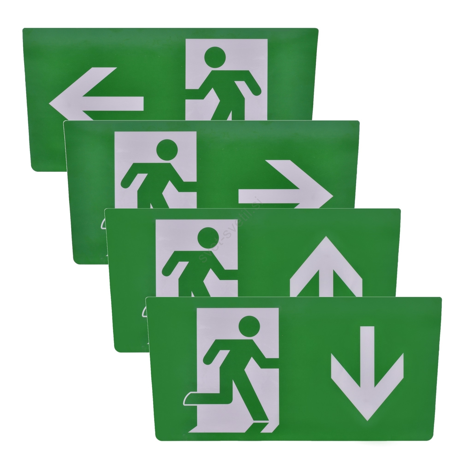 • V kompletu so 4 samolepilni piktogrami, ki omogočajo označevanje smeri izhoda glede na potrebe prostora (npr. puščica levo, desno, navzdol).