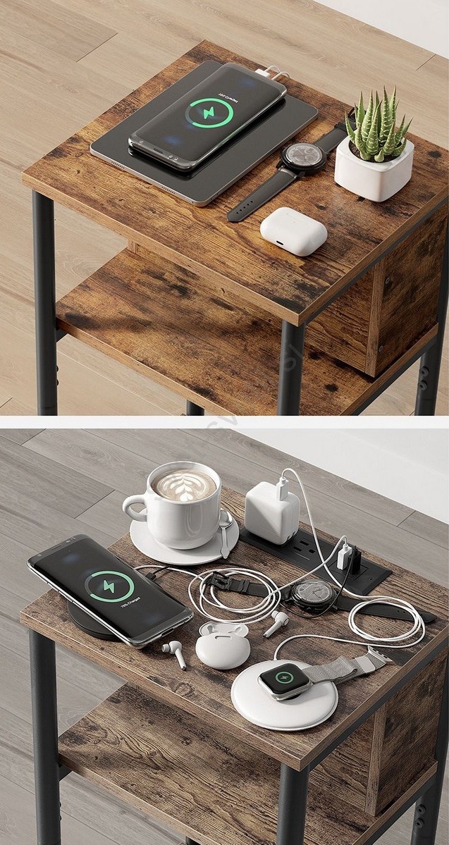 Stranska mizica ROD, rjava/črna, z vgrajenimi vtičnicami in USB-priključki