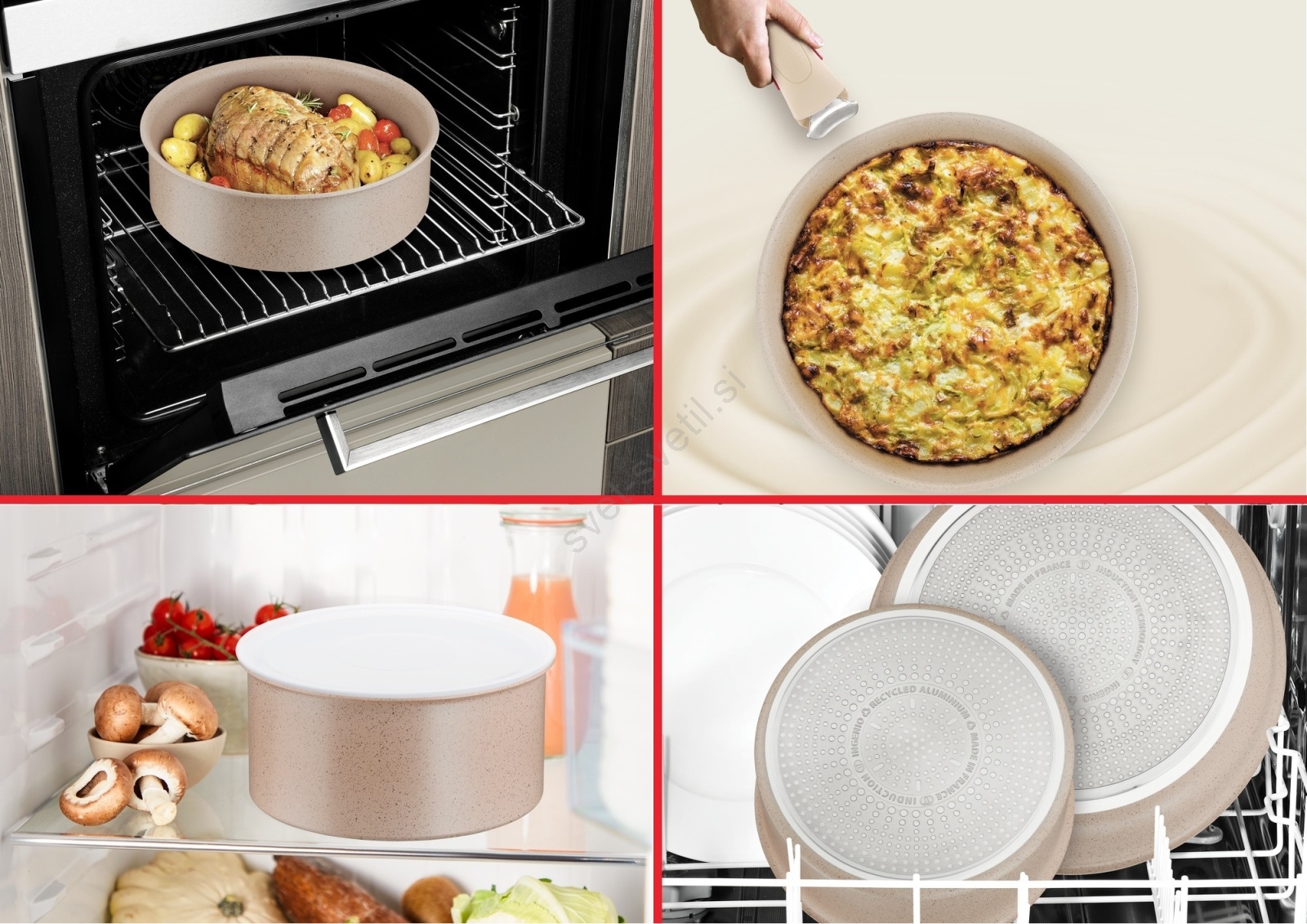 • Konstrukcija je zasnovana z odstranljivim ročajem, ki omogoča učinkovito shranjevanje, uporabo v pečici in serviranje brez ročaja.