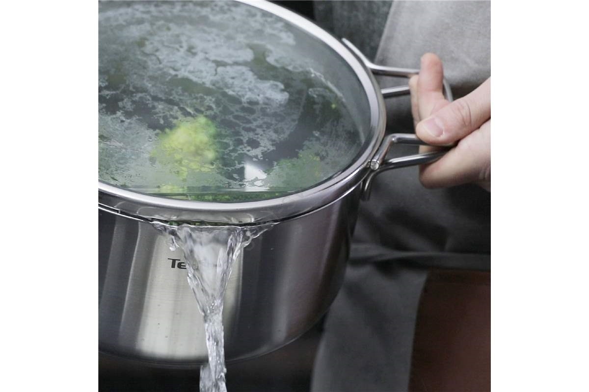 • Praktične lijake z majhnimi odprtinami na vsakem loncu omogočajo neposredno cedjenje (npr. vode iz testenin).