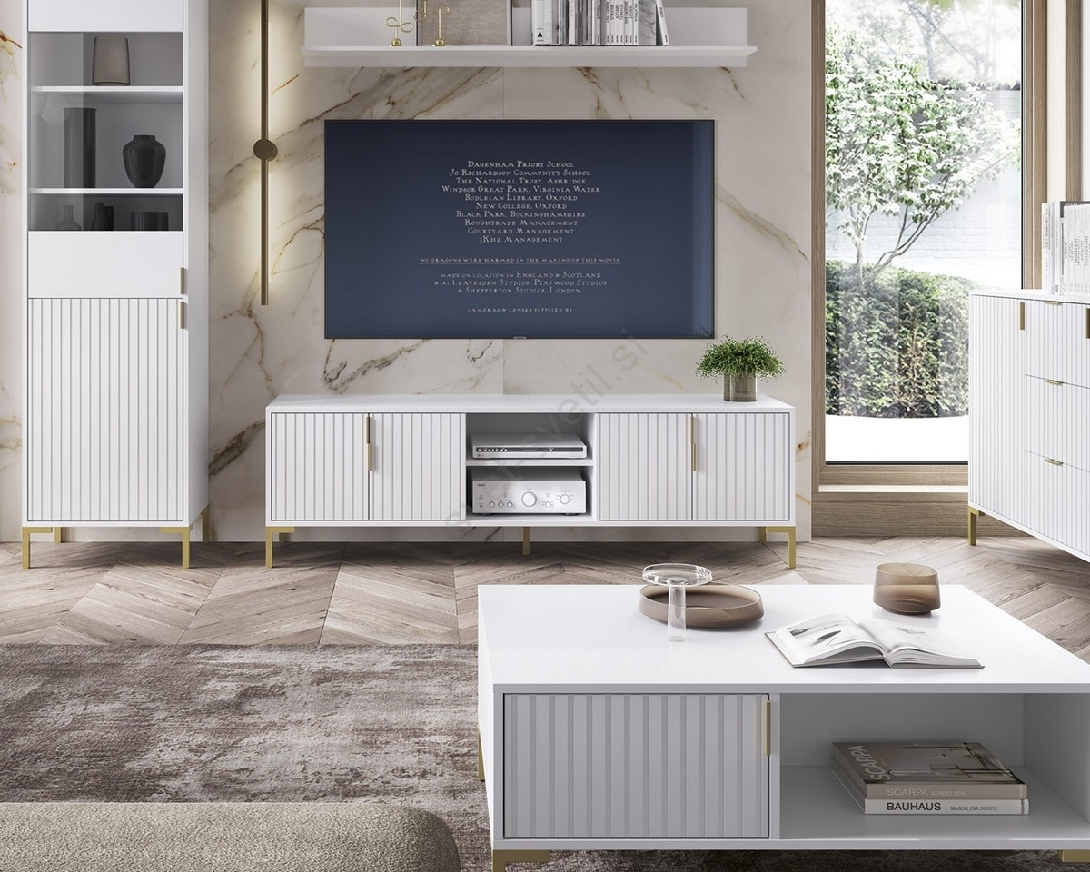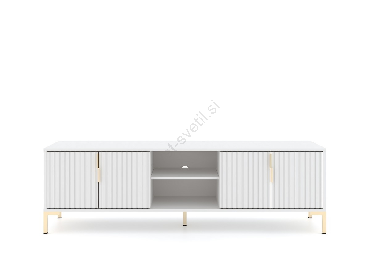 • Ima dve zaprti stranski omarici, vsaka z dvema vratcema s simetričnimi ročaji in rebrastim dekorjem, ter dve odprti polici s prebojem za kabel na sredini.