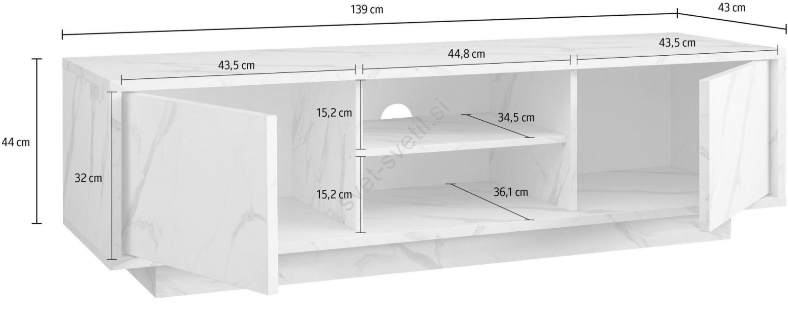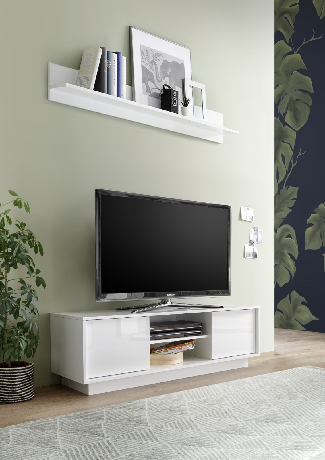 • Spodnji predali in odprte police nudijo prostor za knjige, dekoracije in domače pripomočke.