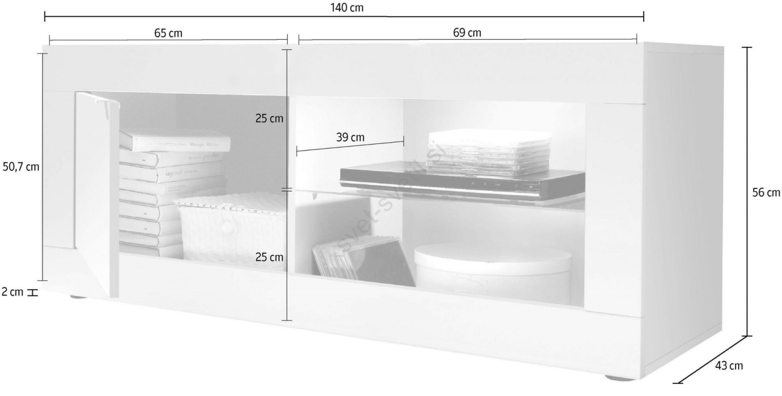 • Zaradi dolgega pravokotnega oblika je idealna za postavitev pod stensko televizijo ali kot sodobna shranjevalna rešitev v dnevni sobi.