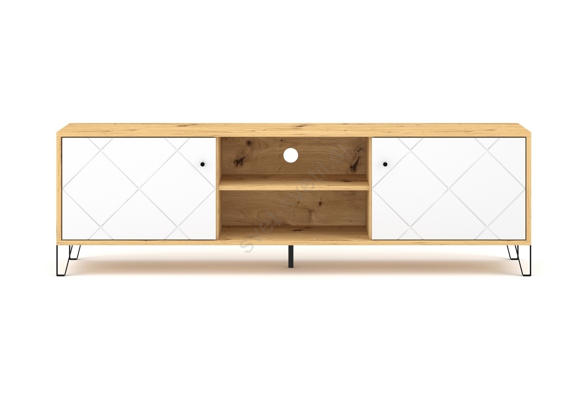 • Vsebuje dve zaprti stranski omarici, vsaka z vrati z dekorativnim diagonalnim vzorcem, in dve odprti polici z izrezom za kable na sredini.