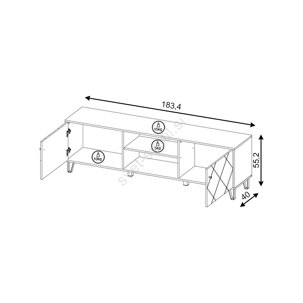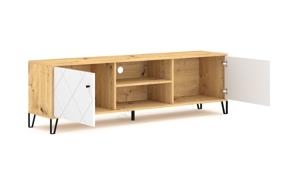 • Ima dve zaprti stranski omarici, vsaka z vrati z dekorativnim diagonalnim vzorcem, in dve odprti polici s odprtino za kable na sredini.