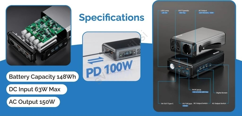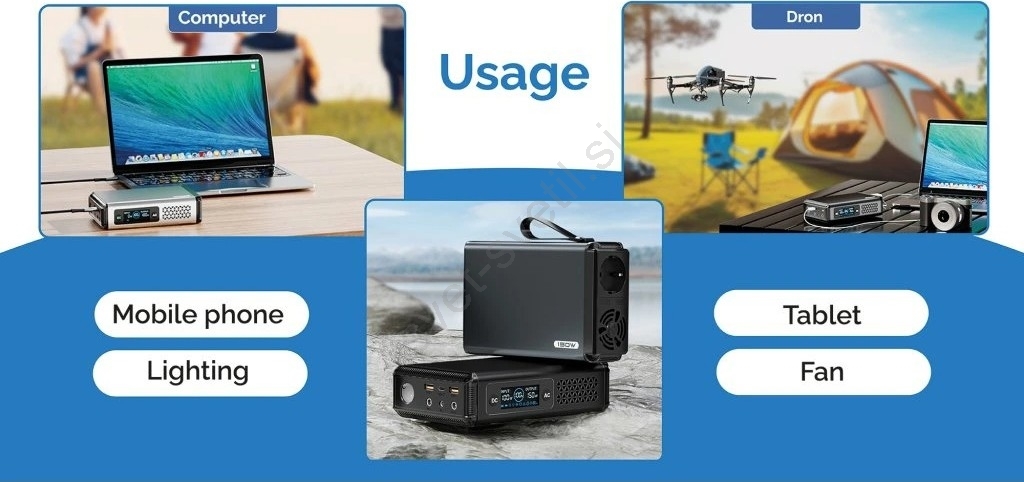 • Univerzalna uporaba zaradi različnih izhodov (USB-C, USB-A, DC priključek 5521, AC 230 V).
