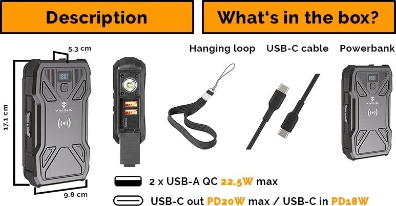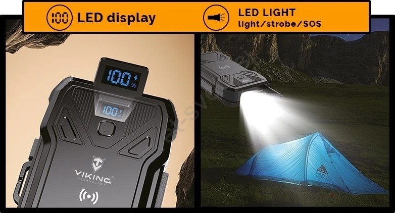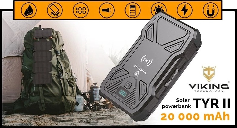 Viking - powerbank z LED svetilko, brezžičnim polnjenjem in solarnim panelom Power Delivery 22,5W/20000 mAh