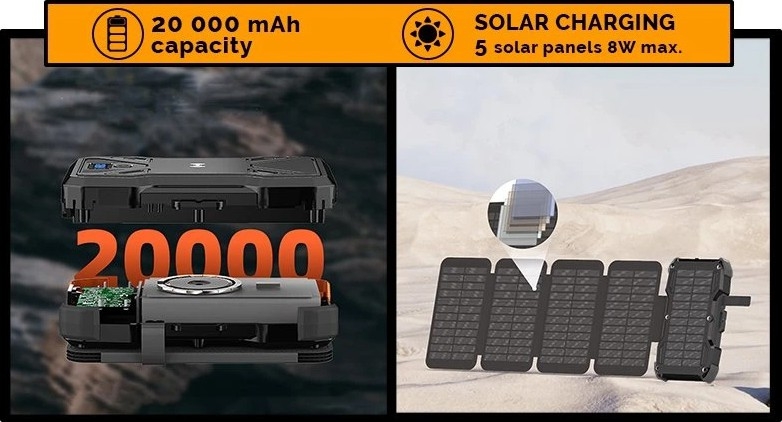 • Zahvaljujoč inovativnemu zložljivemu sončnemu panelu lahko polnite svoje naprave s sončno energijo in tako vedno imate popolnoma napolnjen telefon, tablico ali drugo elektroniko.
