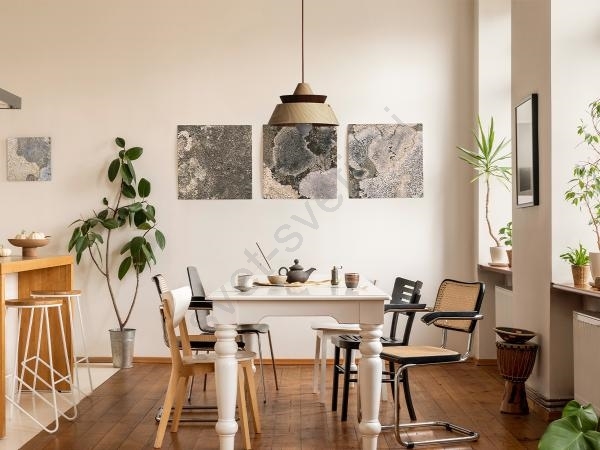 Dnevna soba in spalnica, Leseni lestenci, Lestenci, Lestenci, Notranja razsvetljava, Po prostorih, Svetila