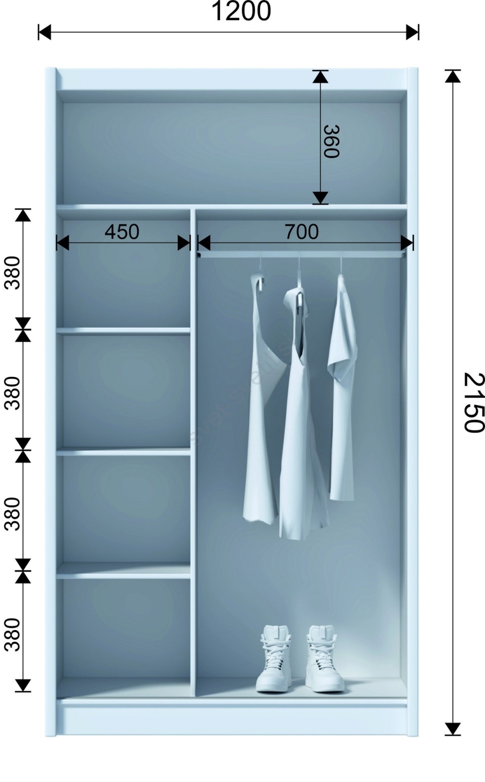 • Omara ima 4 odprte police, garderobno palico in zgornjo polico za shranjevanje torb in sezonskih predmetov.