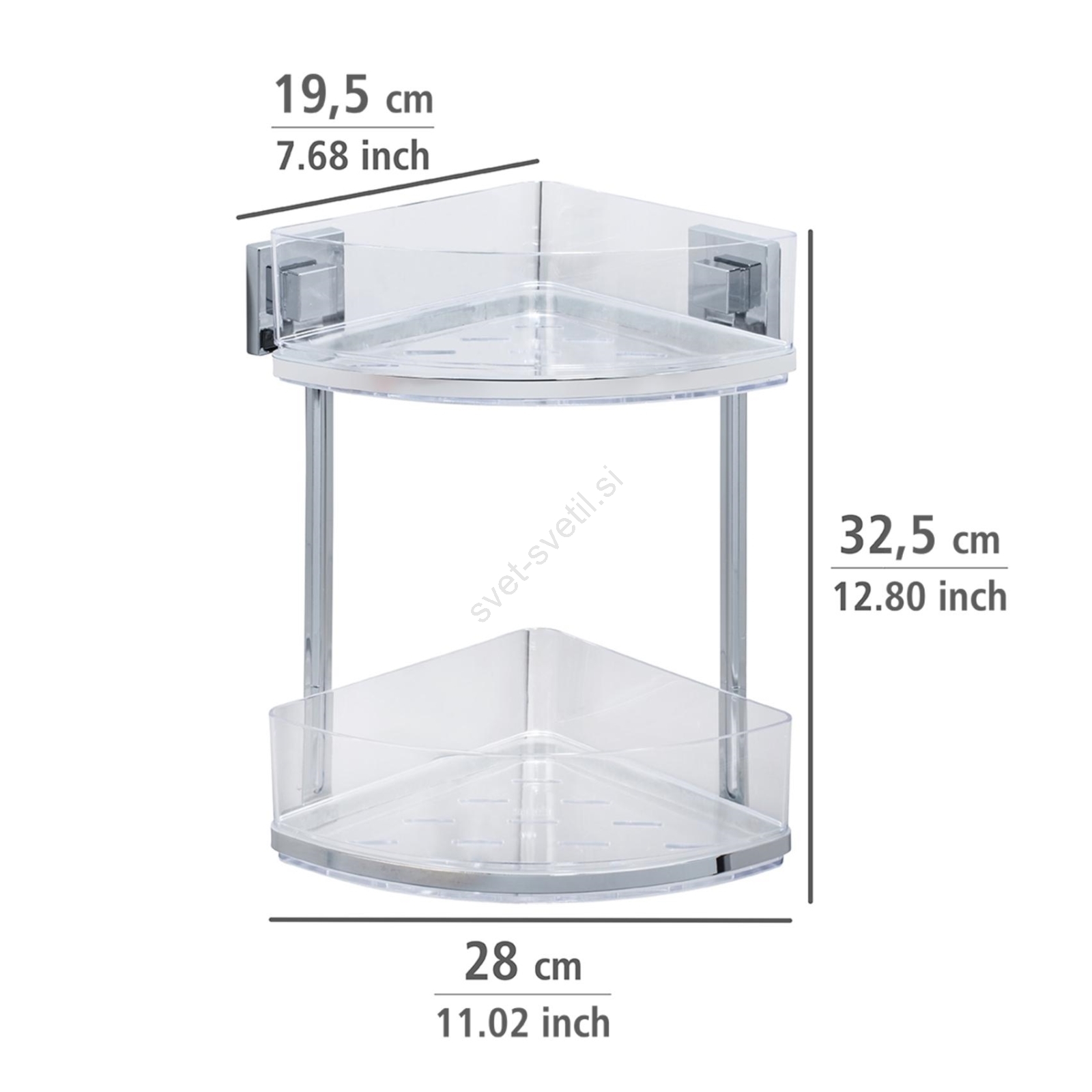 • Kotna polica z dvema nivojema – idealna za pregledno shranjevanje kopalniških pripomočkov.