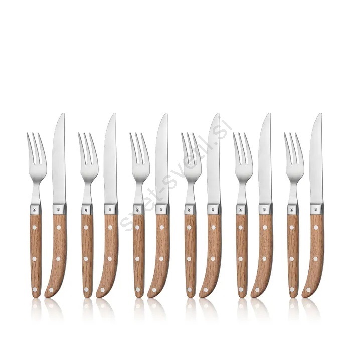 • Premijski set za ljubitelje zrezkov – vsebuje 6 nožev za zrezke in 6 vilic, zasnovan za udobno postrežbo mesa.