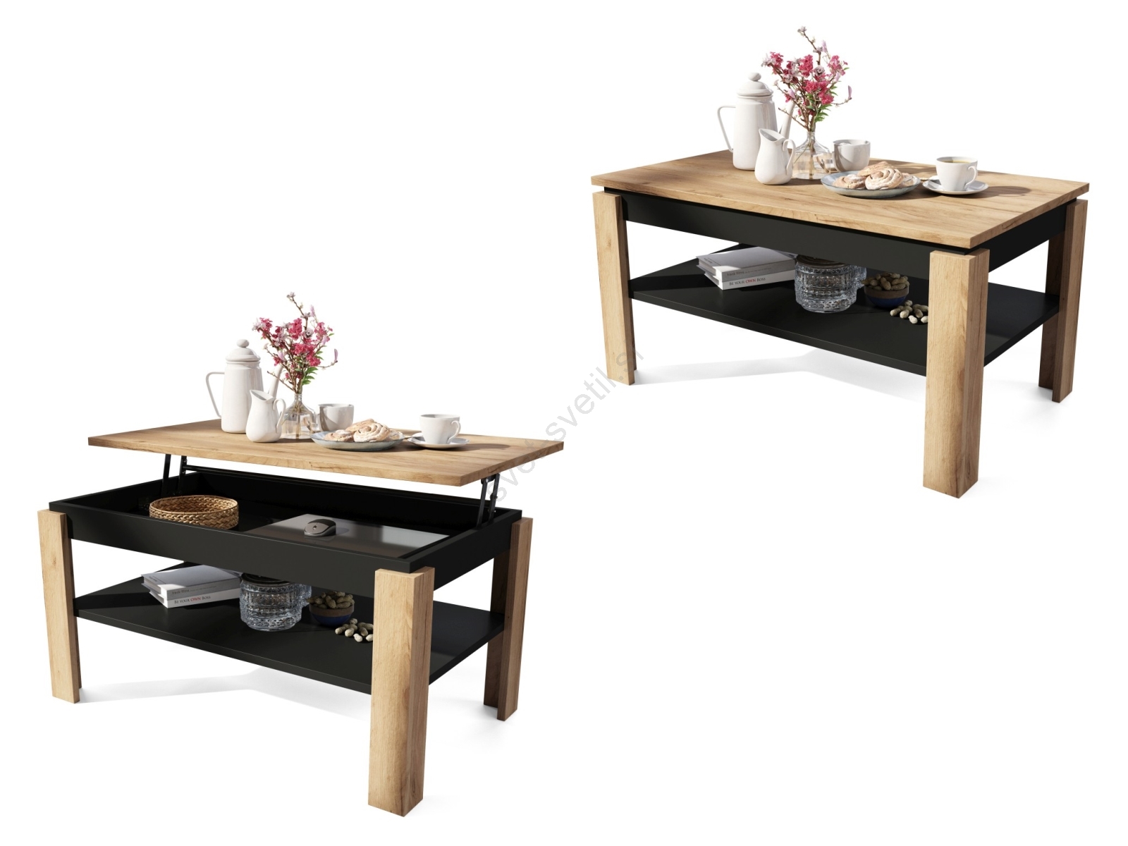 Raztegljiva konferenčna mizica ADEN z dvignljivo ploščo in polico, hrast craft/črna