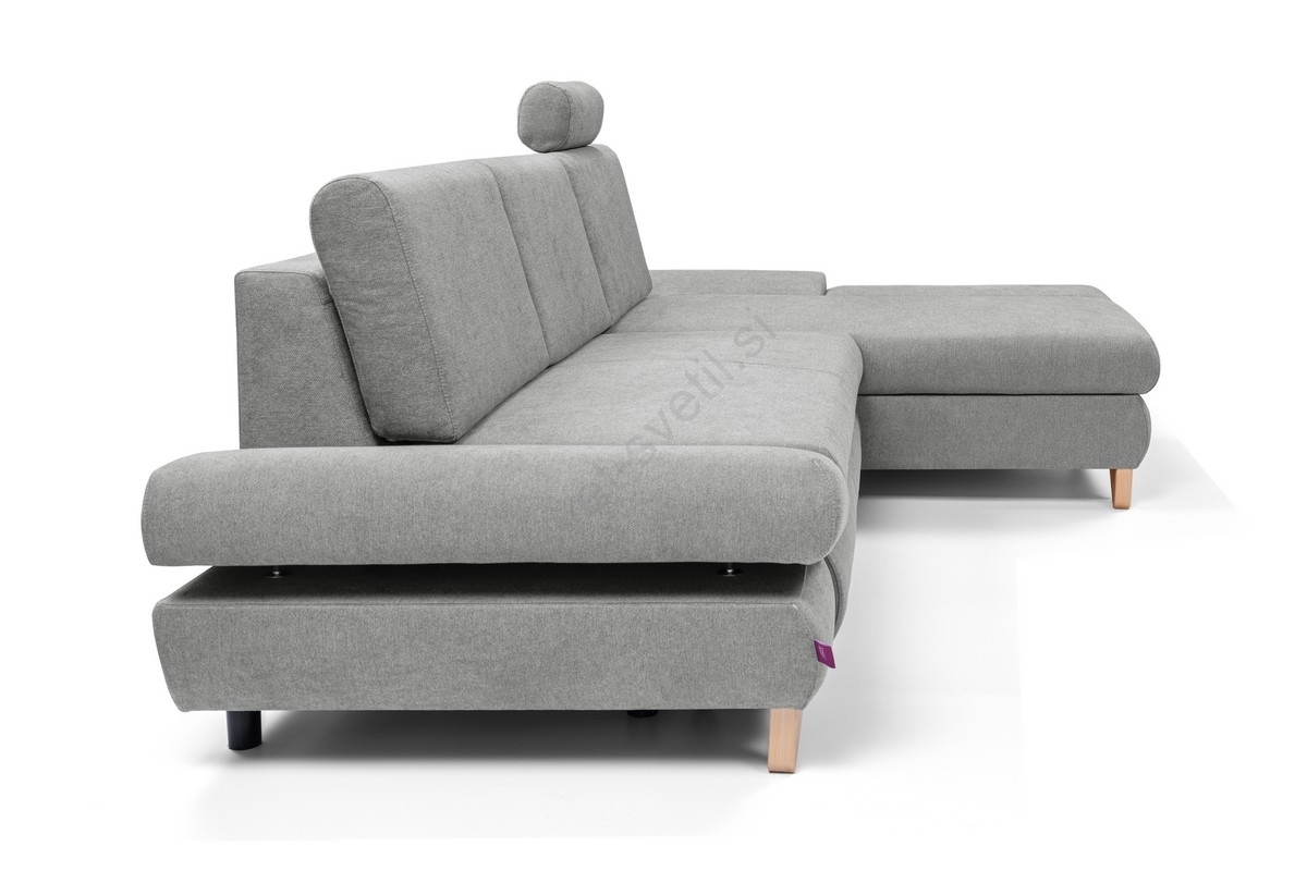 • Raztegljiva kotna oblazinjena sedežna garnitura v L-obliki AVESTA, desna, s predalom za shranjevanje, siva