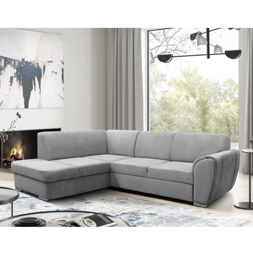 Raztegljiva kotna sedežna garnitura SERPA v obliki L, leva, siva, z možnostjo raztegovanja v ležišče in s prostorom za shranjevanje